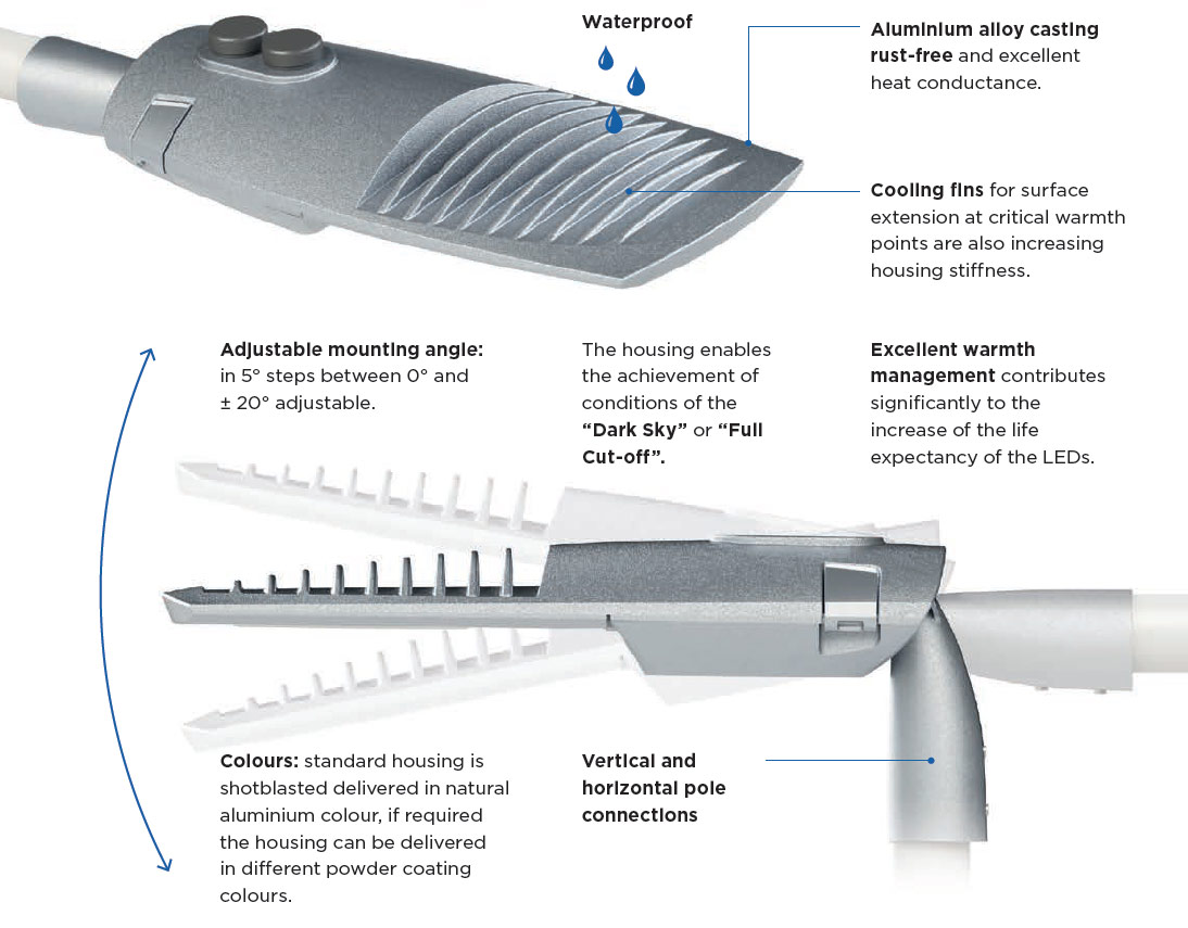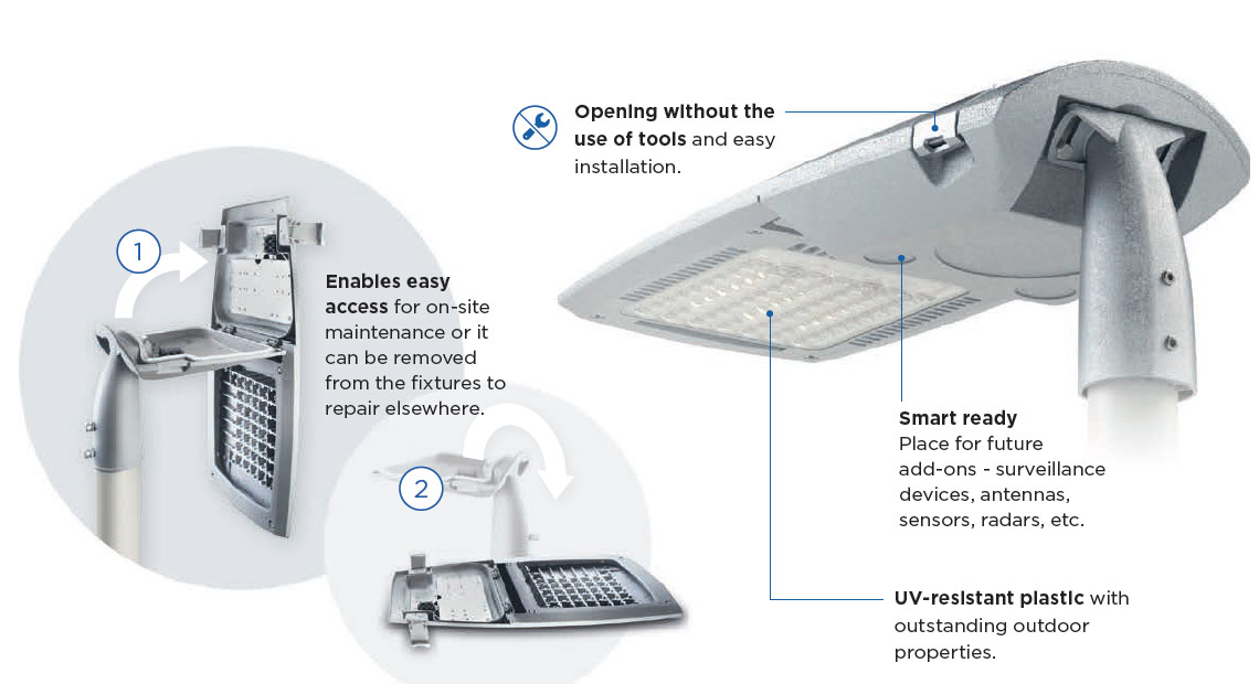 Perfecting the extraordinary lighting and providing durability and high-performance of the luminaires are the quality built-in light engines made for extreme weather conditions. To ensure luminaires answer to individual requirements the design allows future add-ons, such as surveillance devices, antennas, sensors, radars and others. All the features are enclosed in this efficient luminaire with easy access ready for routine checks or installations.