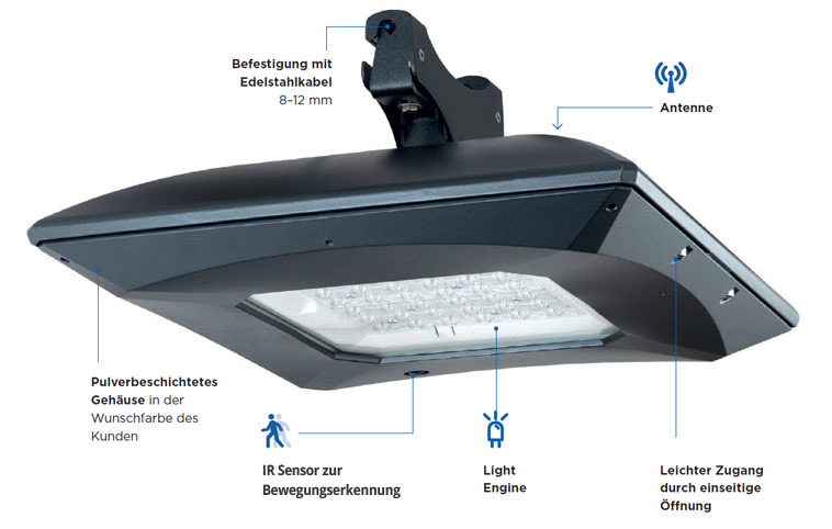 Diese beständige und leistungsstarke LED-Leuchte ist eine hervorragende Lösung für die Straßenbeleuchtung und wird an einem Edelstahlseil aufgehängt. Dank des integrierten IR- oder Mikrowellensensors zur Bewegungserkennung erhöht diese Leuchte die Sicherheit in der Stadt und trägt zur Reduzierung des Energieverbrauchs bei.
